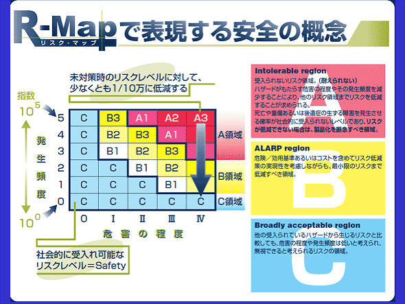市場で起きた製品事故をR-Map上で判断させようとしたとき、重要なのは発生頻度ゼロレベル(最下部のC領域)をどう決めるかということ。