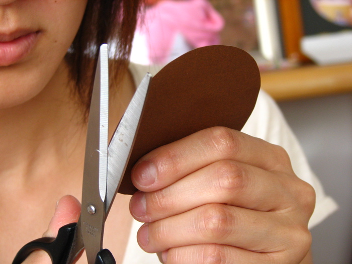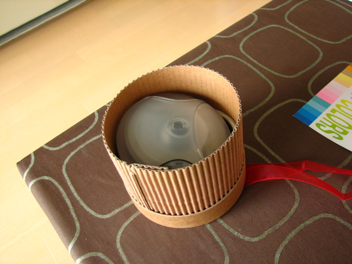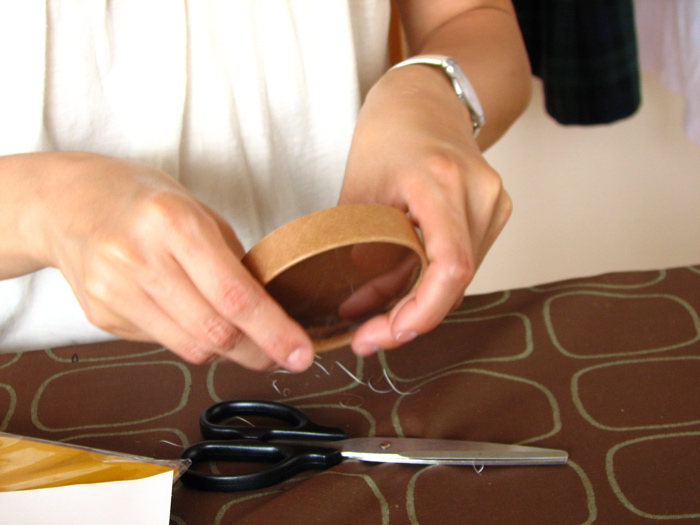 子供の折り紙から、「この色は楽しんで使わないだろう」と思われる、茶色・黄銅色なんかをチョイスして色を合わせてみる。茶色がいいかな。妻が蓋に合わせて丸く切る。