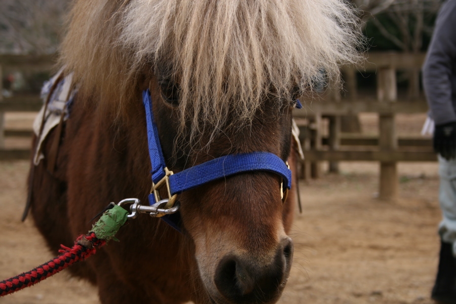 厩舎に行くとポニーが2頭、草を食べていた。やっぱ馬よりポニーの方がちっちゃくてカワイイなぁ。